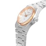 ترکیب طلایی براق و استیل نقرهای صیقلی، ظاهری شیک و لوکس به این ساعت داده است. صفحهی صدفی سفید با بافت خاص خود در زوایای مختلف نور جلوه متفاوتی دارد و جلوه زنانه و دلنشینی را ایجاد میکند. طراحی بدنه باریک، این مدل را مناسب برای انواع مچهای ظریف کرده است.